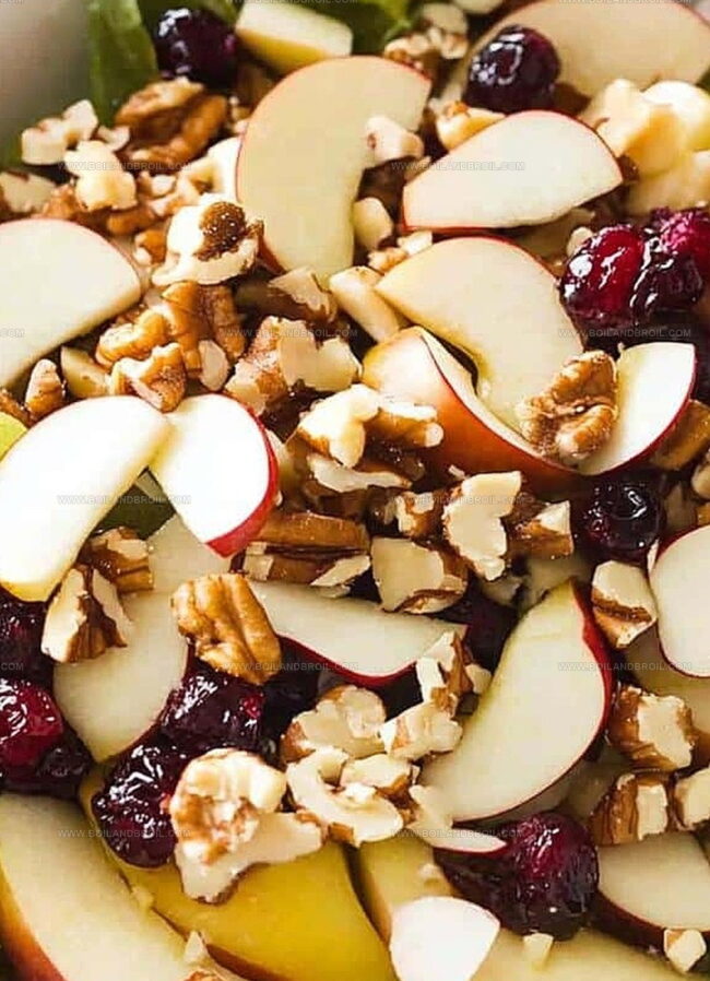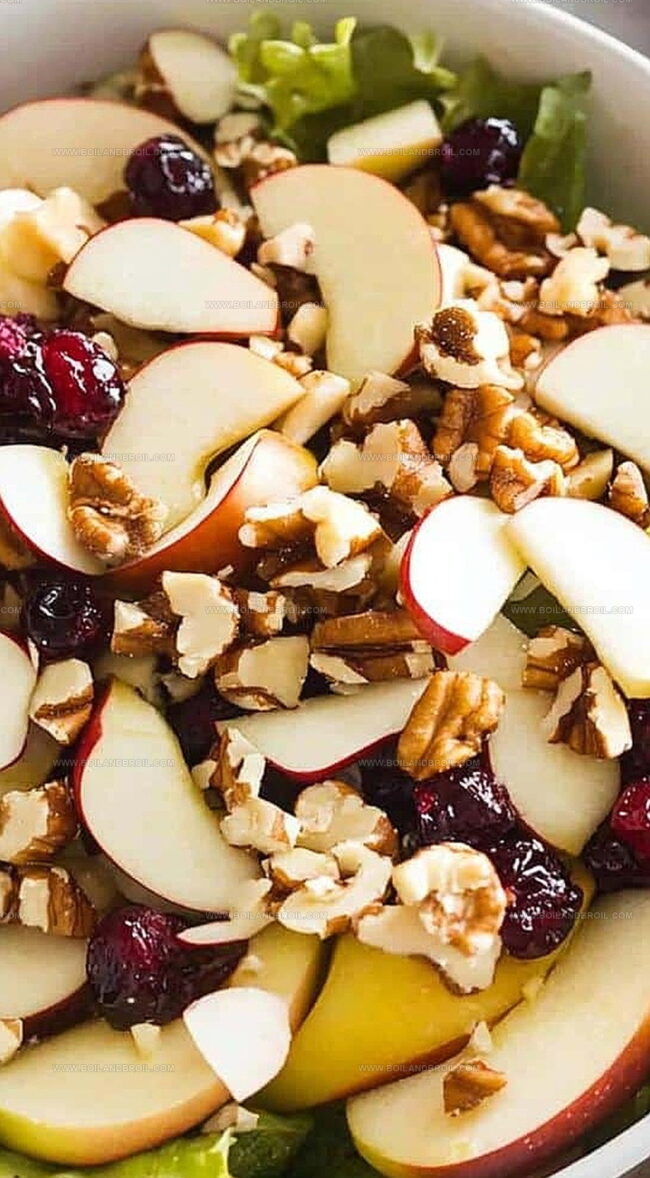 - Scatter prepared apple slices across the greens, then generously sprinkle chopped walnuts, crumbled feta, dried cranberries, and optional bacon bits to create a diverse flavor landscape.