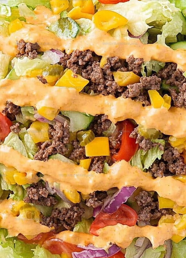 Savor classic big mac salad flavors without the bun, blending zesty dressing and hearty burger ingredients in one delightful dish. Crisp lettuce, juicy beef, and tangy sauce create a low-carb twist that satisfies your craving for an iconic fast-food favorite.