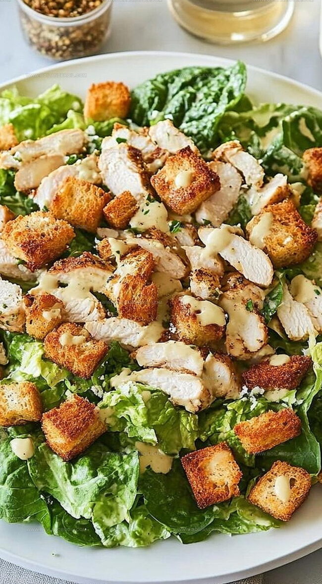 - Layer chopped romaine lettuce in a large serving bowl. Top with grilled chicken and homemade croutons. Drizzle generously with Caesar dressing, gently tossing to ensure even coating. Garnish with additional grated Parmesan.