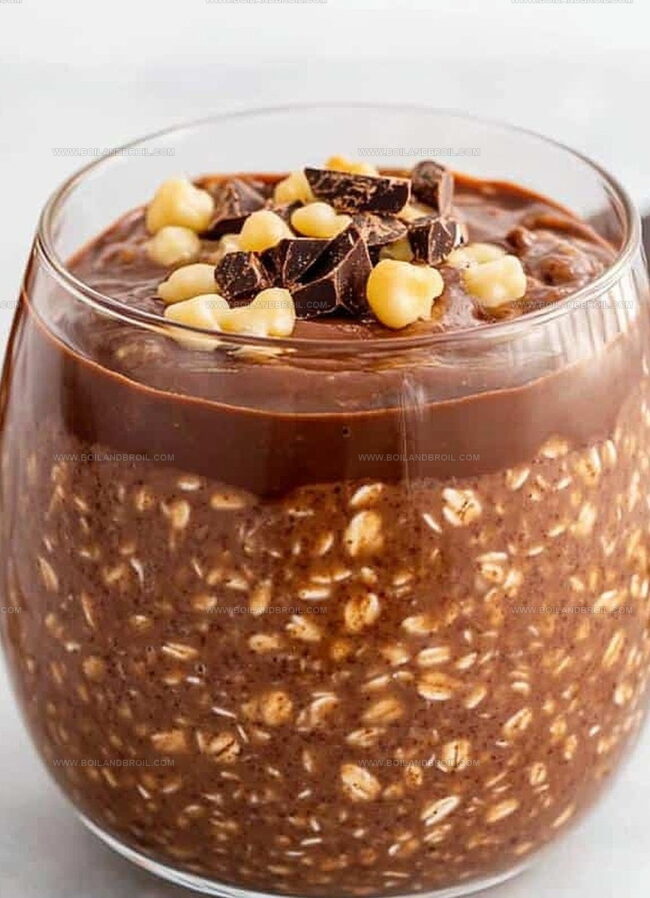 - Remove from refrigerator and gently stir the chilled oats. Transfer to serving bowl and customize with optional toppings like extra chocolate chips, jam, nuts, or fresh berries to enhance flavor and texture.