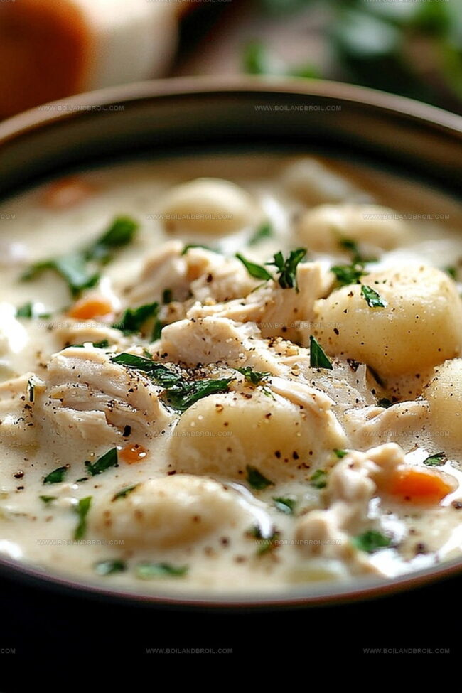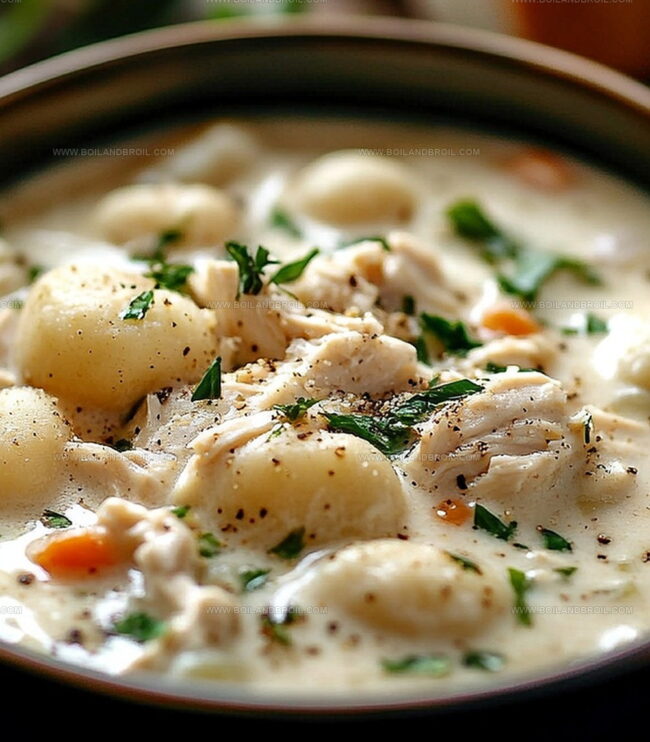 Soft potato dumplings float alongside tender chicken pieces in a velvety broth that whispers home-cooked memories.