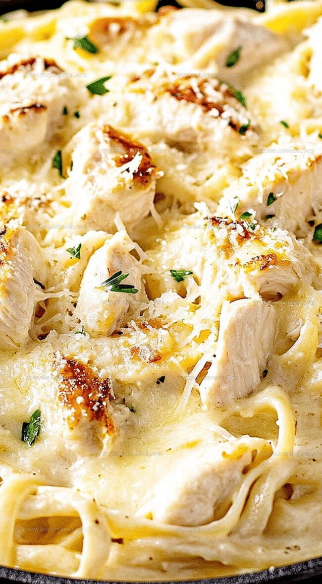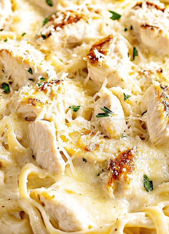 Tender chicken pieces nestle perfectly amid silky pasta strands coated in a rich, velvety sauce.