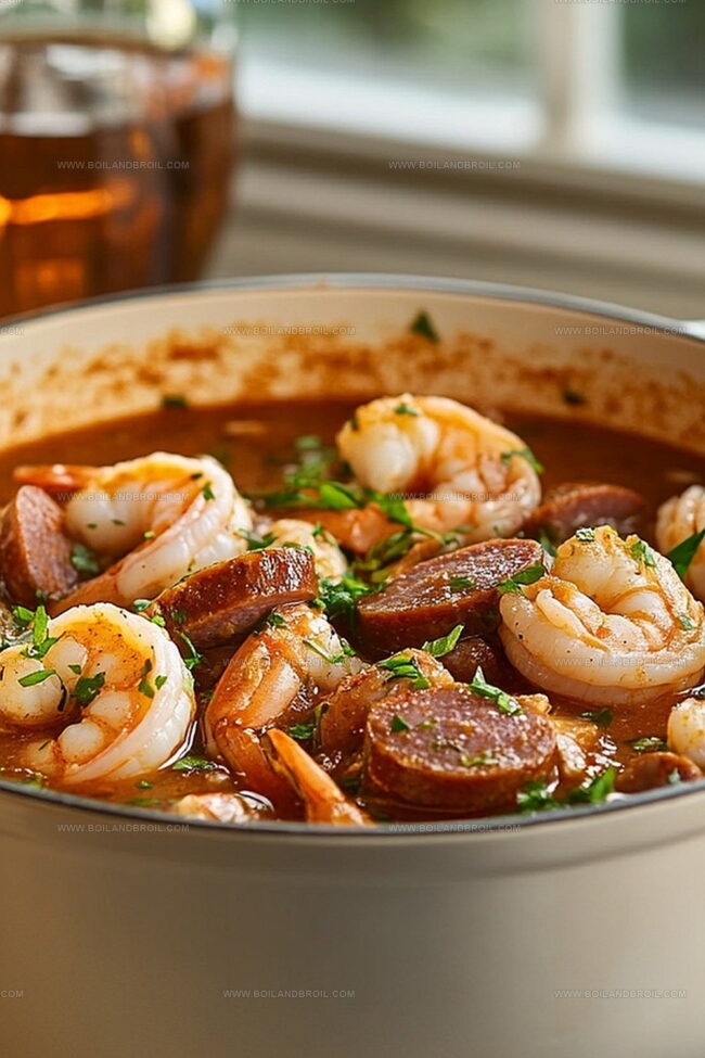 Spicy andouille sausage dances with tender shrimp in a deep, complex broth that whispers tales of creole heritage.