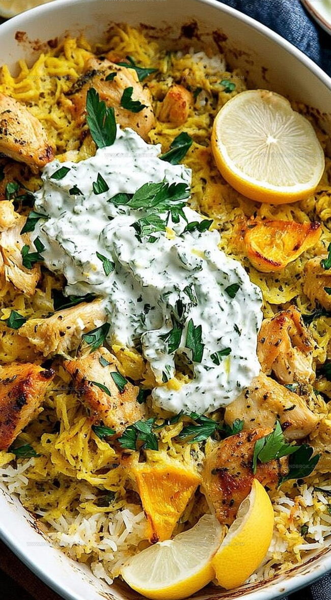 The combination of long-grain white rice, chicken, tzatziki sauce, and Greek-inspired spices like oregano and garlic powder creates a Mediterranean-style one-dish meal that’s both creamy and flavorful.