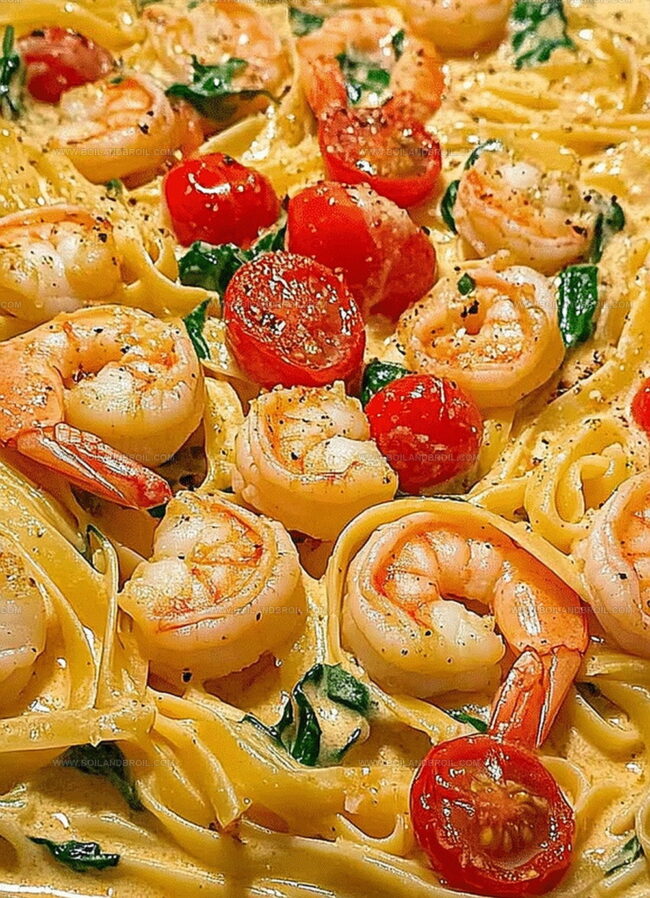 Creamy pasta nights reach new heights with this decadent fettuccine with shrimp, tomatoes, and spinach cream sauce that promises restaurant-quality flavors right in your kitchen.
