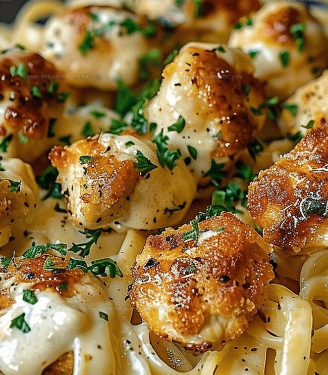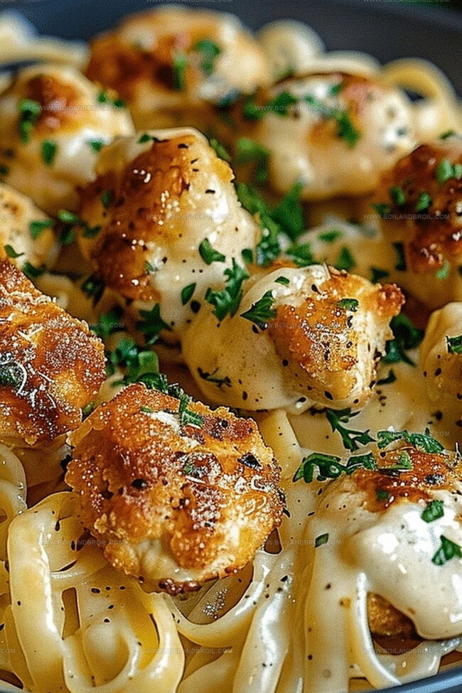 Chicken Bites Tossed with Garlic and Creamy Pasta