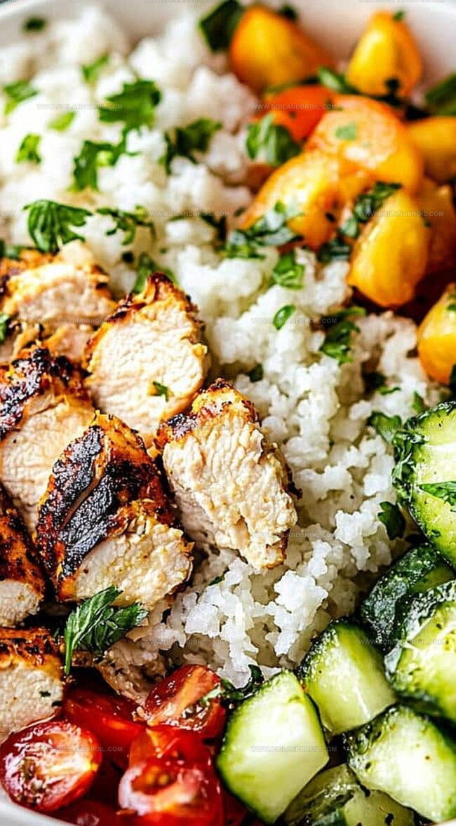 Marinated chicken nestles atop a bed of crisp greens and wholesome grains, creating a balanced plate that satisfies and nourishes.