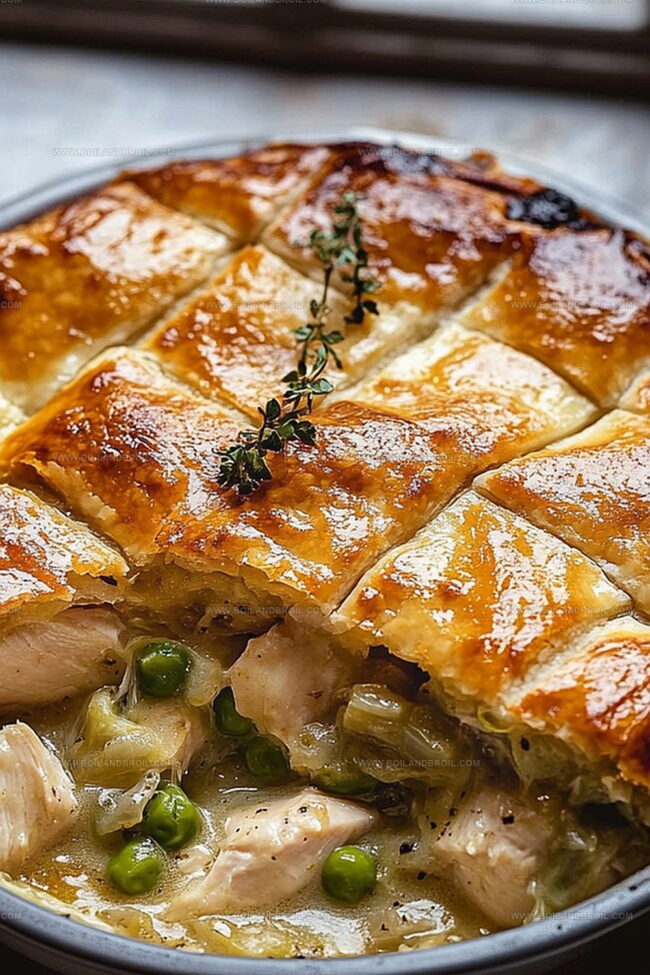 Layers of tender chicken embrace creamy leek sauce beneath a golden, flaky crust.