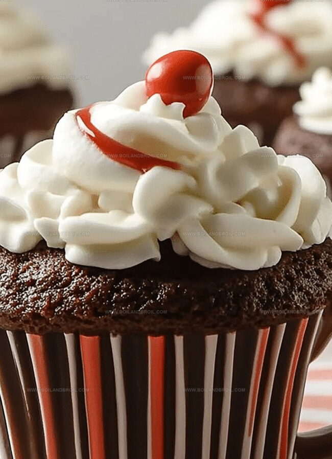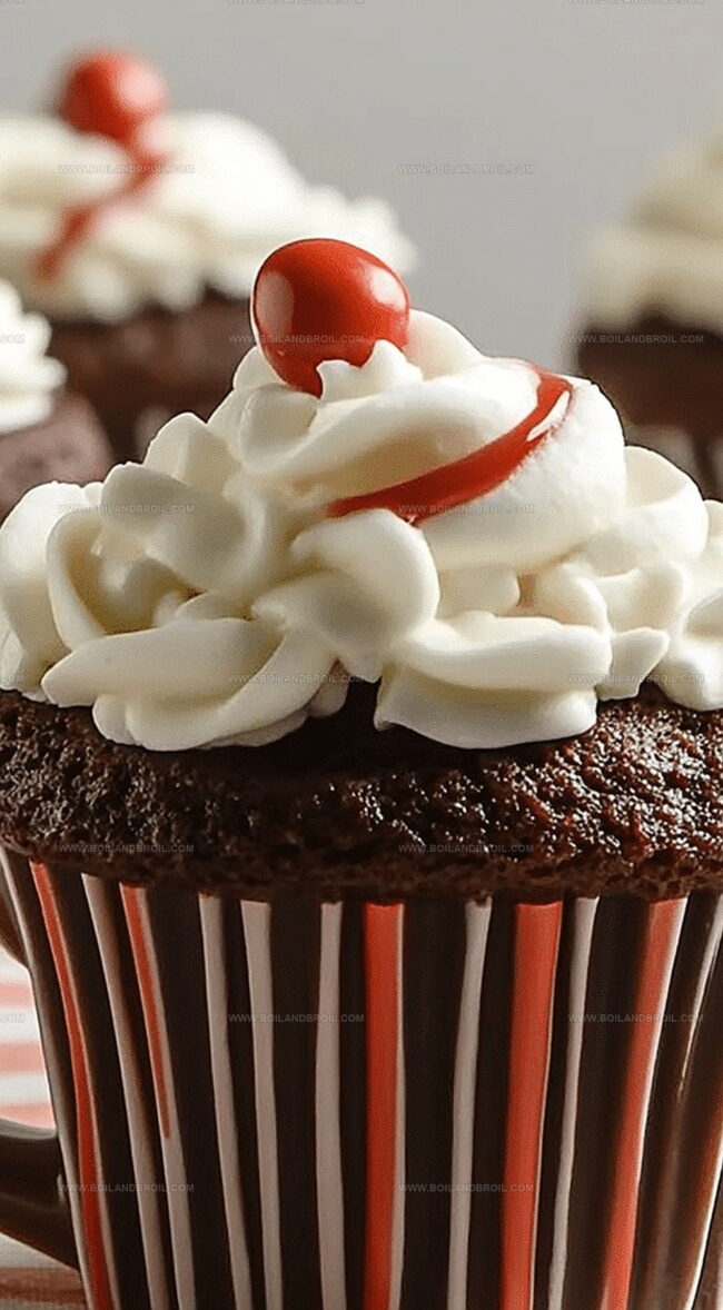 These charming desserts capture the essence of a warm chocolate drink in a delectable cupcake form.