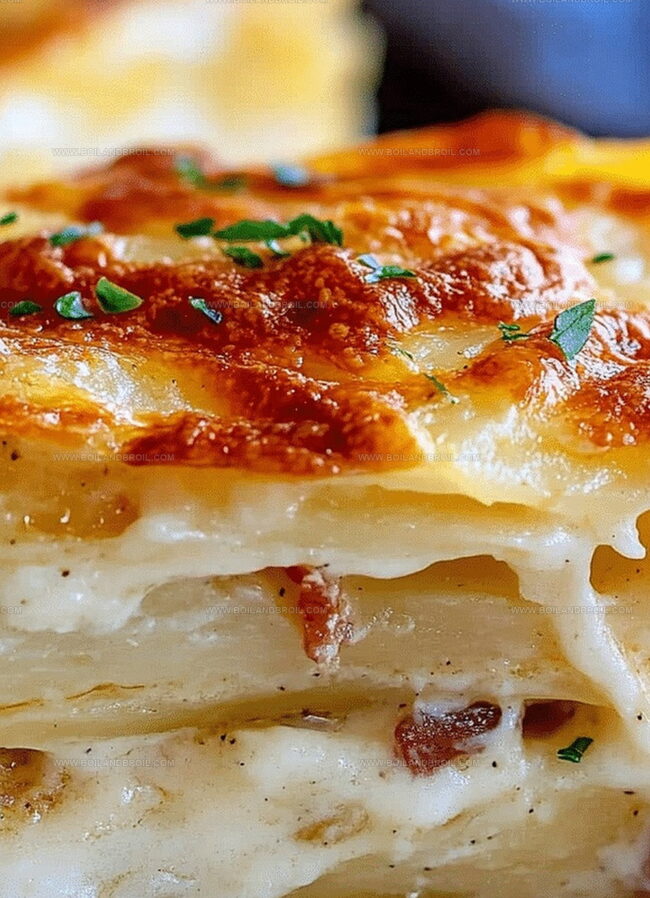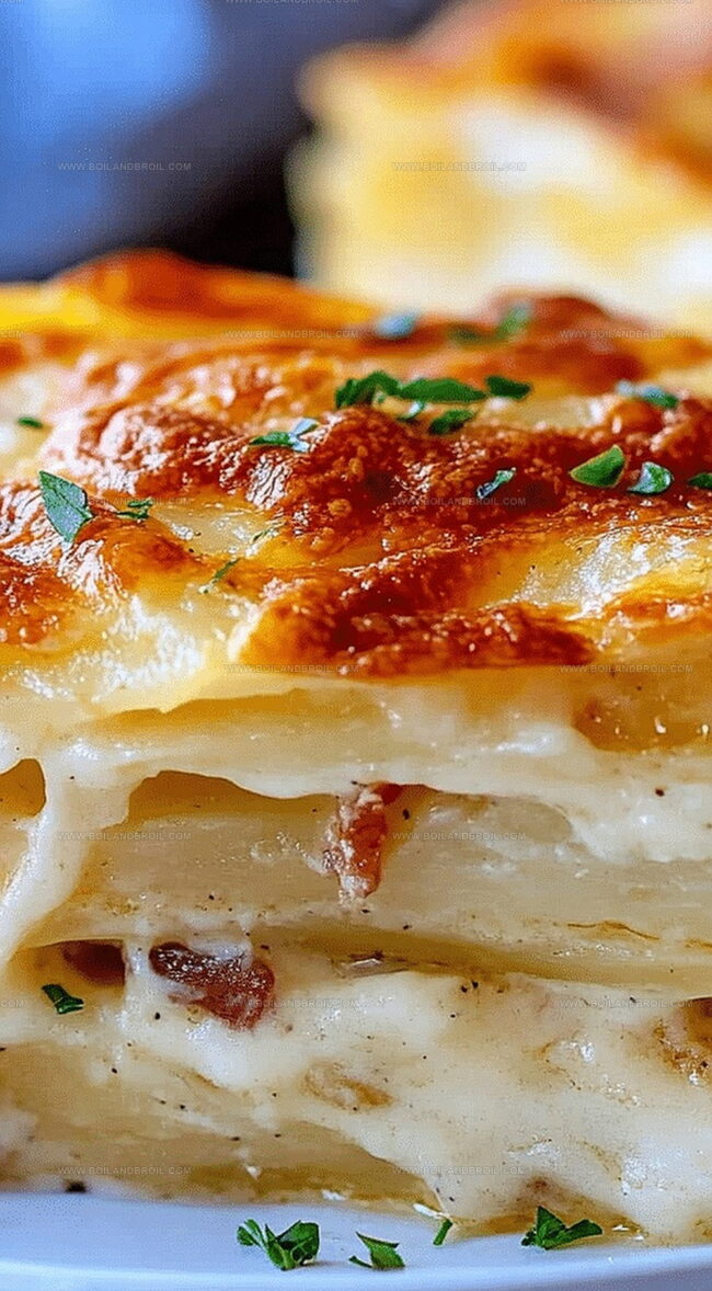 Layers of thinly sliced potatoes nestled between melted cheese and crispy bacon create a mouthwatering experience.