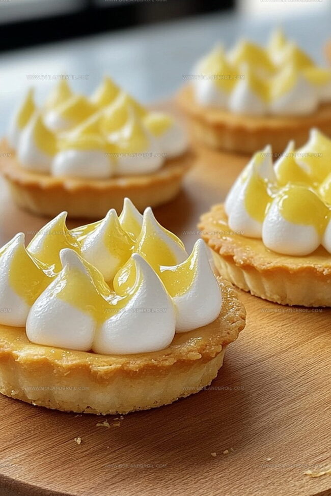 - Crown each tart with meringue, ensuring complete coverage to tart edges. Bake at 350F (175C) for approximately 10 minutes until meringue turns golden brown.