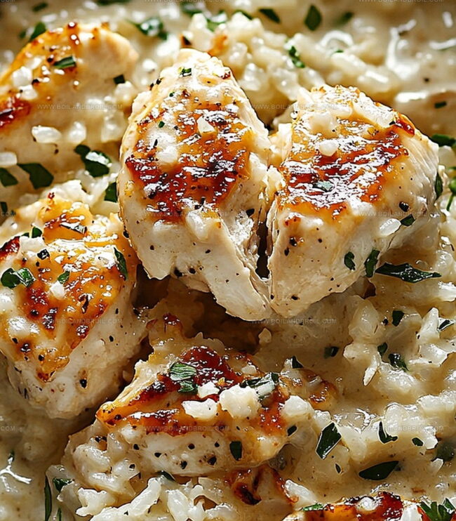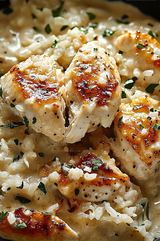 Perfectly seasoned protein nestles into a creamy rice landscape, promising a dinner that feels both indulgent and effortless.