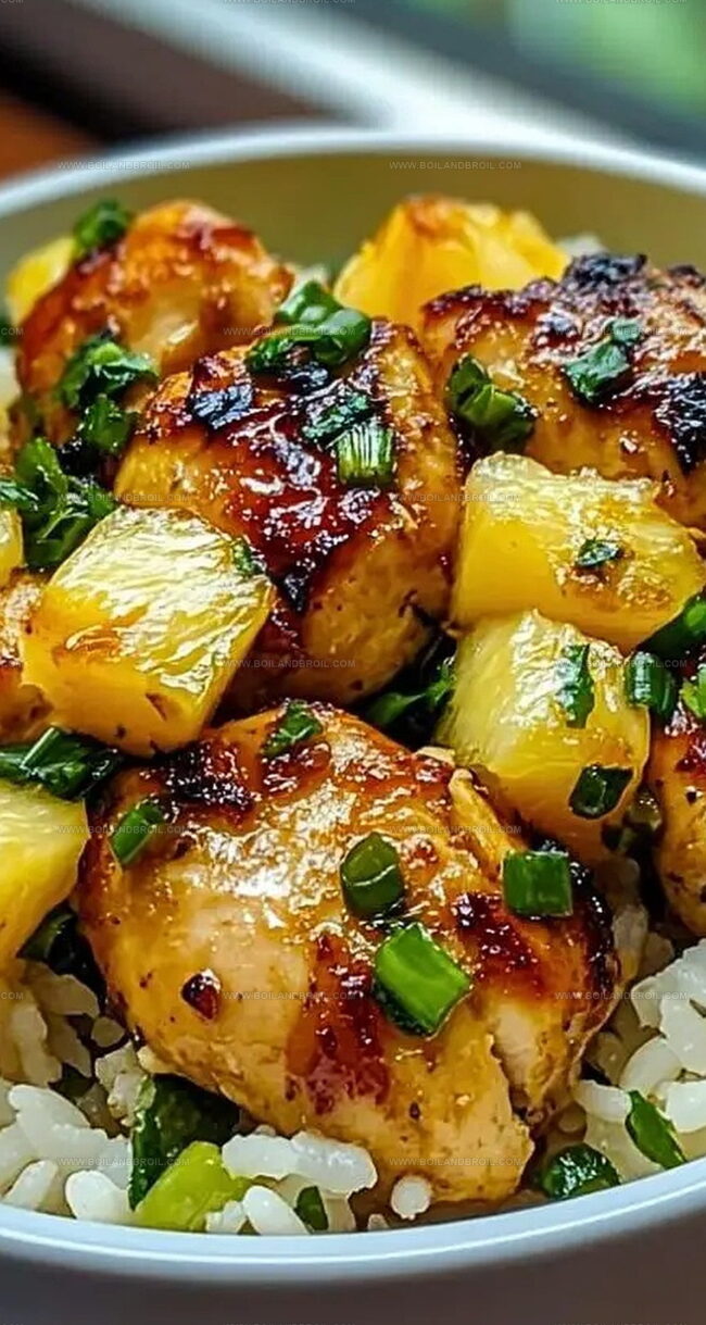 Tropical Pineapple Chicken and Rice brings sweet and savory flavors from Hawaiian cuisine to your dinner table. Juicy chicken chunks nestled with caramelized pineapple create a perfect balance over fluffy rice that promises a delightful culinary escape.