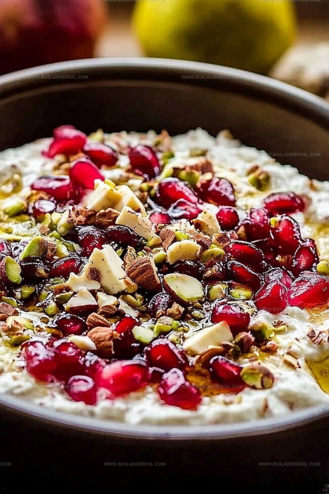 Creamy cheese blends seamlessly with nutty pistachios and bright ruby-red seeds.