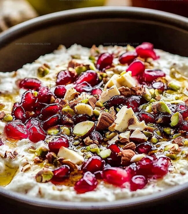 - Scatter fresh pomegranate seeds over the top, allowing their vibrant ruby color to contrast against the creamy white base.