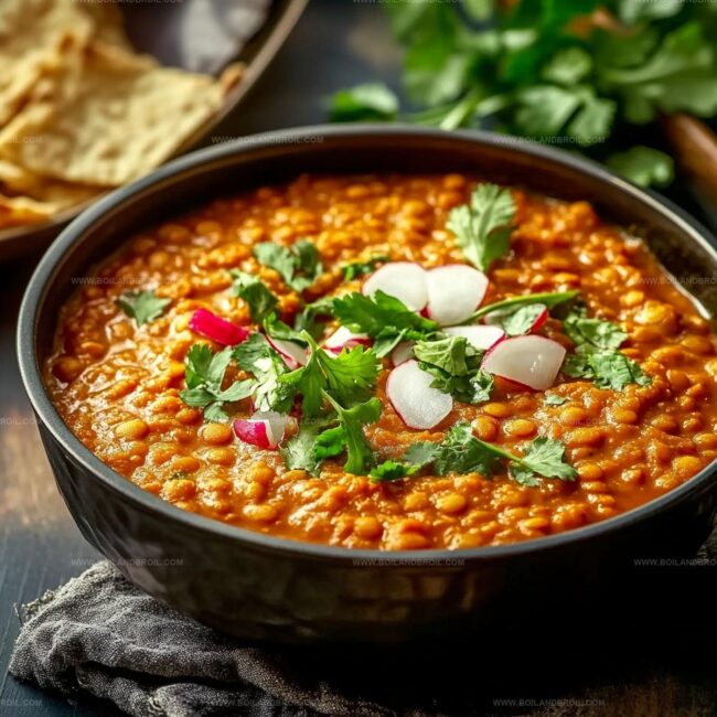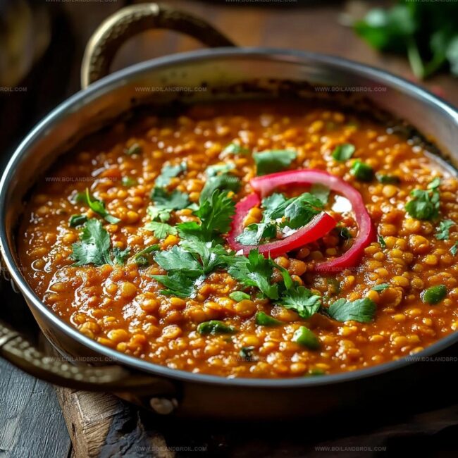Spicy Indian red lentil dhal brings warmth and comfort to your dinner table with its rich, aromatic blend of traditional spices. Creamy lentils simmered in fragrant curry leaves and turmeric create a nourishing meal you’ll savor with each comforting spoonful.