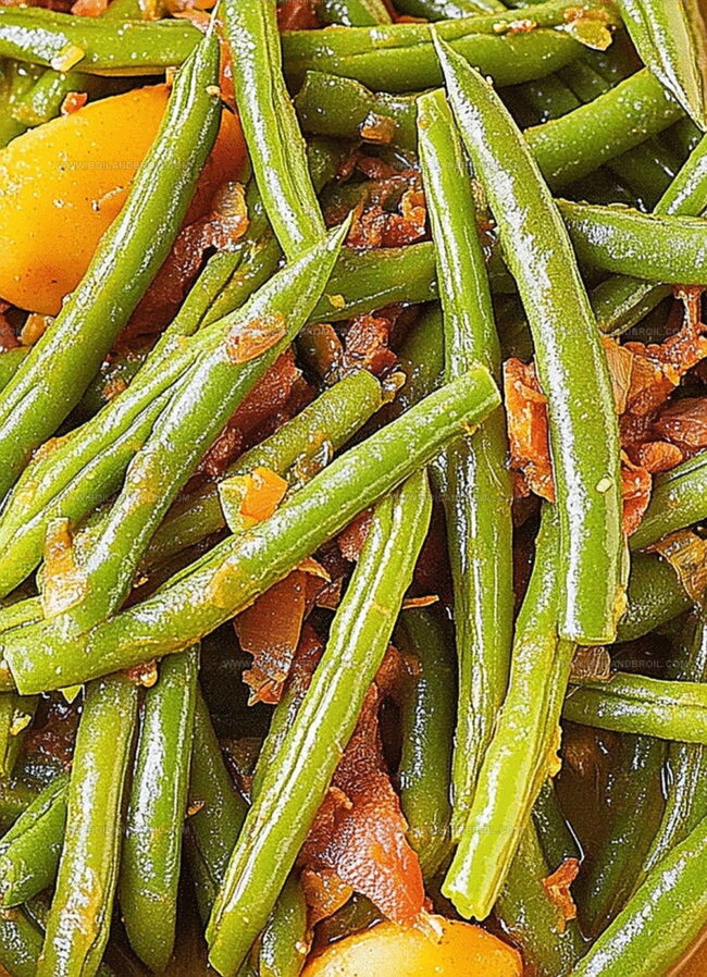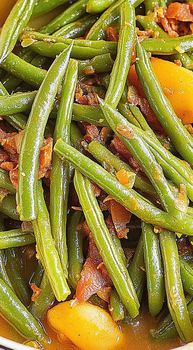 Crisp green beans melt into a savory, slow-cooked delight that speaks to comfort and tradition.