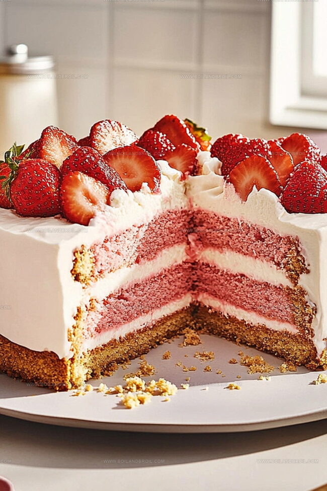 - Carefully spread softened strawberry ice cream across the cake surface, creating an even layer. Strategically arrange fresh strawberry slices over the ice cream layer.
