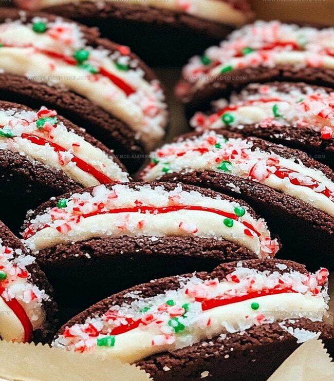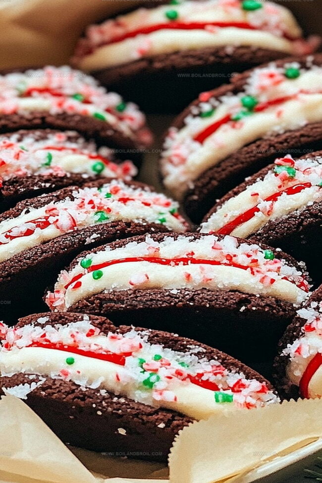 Festive striped peppermint sandwich cookies bring winter magic to holiday dessert tables. Crisp candy cane-striped cookies embrace creamy peppermint filling, delivering sweet nostalgia that delights guests and satisfies seasonal cravings.