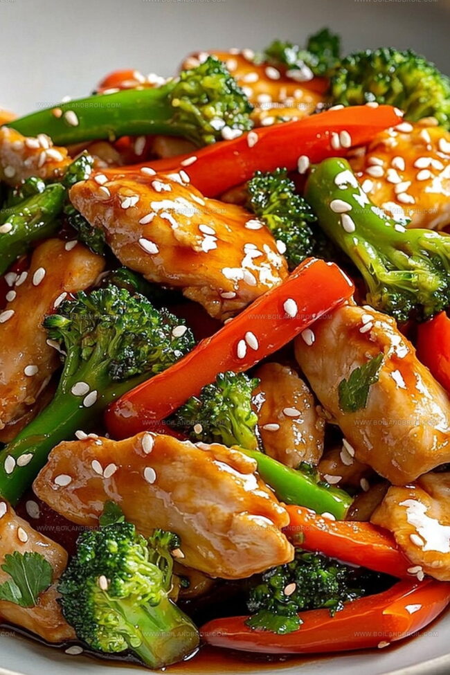 Colorful bell peppers and zucchini dance alongside succulent chicken pieces bathed in glossy teriyaki glaze.