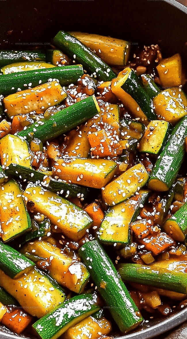 - Increase heat to medium-high and introduce zucchini to the skillet, immediately pouring soy sauce, teriyaki, and hoisin sauce over the vegetables.